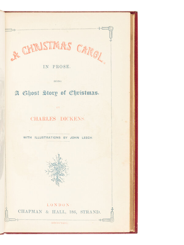 A Christmas Carol. In Prose. Being a Ghost Story of Christmas. London: [Bradbury and Evans for] Chapman & Hall, 1843. Half-title printed in blue, title printed in red and blue, verso printed in blue. Hand-colored etched frontispiece and 3 plates by and after John Leech, 4 woodcut illustrations by W. J. Linton after Leech; 2-pp. publisher’s ads at rear. (Small marginal chip near head on p.79.) FIRST EDITION, FIRST ISSUE with the uncorrected “Stave 1” as the first chapter heading, the balance of the text uncorrected.