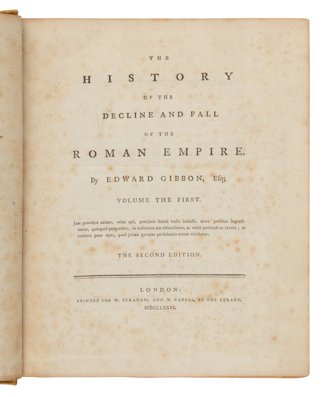 GIBBON, Edward (1737-1794). History of the Decline and Fall of the Roman Empire, Volume the First [-Sixth]. London: W. Strahan & T. Cadell, 1776-1788.
