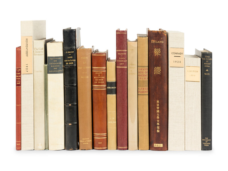 CONRADY, August (1864-1925). Die Chinesischen Handschriften und Sonstigen Kleinfunde Sven Hedins in Lou Lan. Stockholm: Generalstabens Litografiska Ansalt, 1920. -- FISCHER, Otto (1886-1948). Die Chinisische Maleri der Han-Dynastie. Berlin: Paul Neff Verlag, 1931. LIMITED EDITION, number 210 of 250 copies. -- LAUFER, Berthold (1874-1934). Chinese Clay Figures. Chicago: Field Museum of Natural History, 1914. -- SALMONY, Alfred (1890-1958). Sino-Siberian Art in the Collection of C.T. Loo. Paris: C.T. Loo, 1933. -- THOMS, Peter Perring (1791-1855). A Dissertation on the Ancient Chinese Vases of the Shang Dynasty from 1743 to 1496, B.C. London: Published by the Author, 1851. -- WHITE, William Charles (1873-1960). Tomb Tile Pictures of Ancient China. Toronto: The University of Toronto Press, 1939. -- YETTS, Walter Perceval (1878-1957). The Cull Chinese Bronzes. [London]: Courtauld Institute of Art, 1939. LIMITED EDITION, number 176 of 350 copies. INSCRIBED BY YETTS.