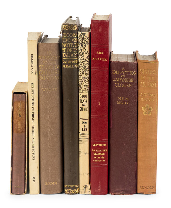 BALL, Katherine Madeline (1859-1952). Decorative Motives of Oriental Art. London: John Lane, the Bodley Head Ltd., 1927. SIGNED BY KATHERINE BALL. -- BINYON, Laurence (1869-1943). Painting in the Far East. London: Edward Arnold, 1908. -- ECKE, Gustav (1896-1971). Chinese Domestic Furniture. Peking: Henri Vetch, 1944. LIMITED EDITION, one of 200 copies. -- GUO, Qinghua. The Structure of Chinese Timber Architecture. Gothenberg, Sweden: Chalmers University Press, 1995. -- INN, Henry and LEE, S.C. Chinese Houses and Gardens. Honolulu: Fong's Inn Limited, 1940. LIMITED EDITION, number 1,175 of 2,000 copies. SIGNED BY INN AND LEE. -- MODY, N.H.N. A Collection of Japanese Clocks. London: Kegan Paul, Trench, Trubner, & Co., Ltd., 1932. LIMITED EDITION, number 25 of 200 copies. -- YAMAGUCHI, Ryuji. The Clocks of Japan. Tokyo: Nippon-Hyoron-sha Publishing Co., Ltd., 1950.