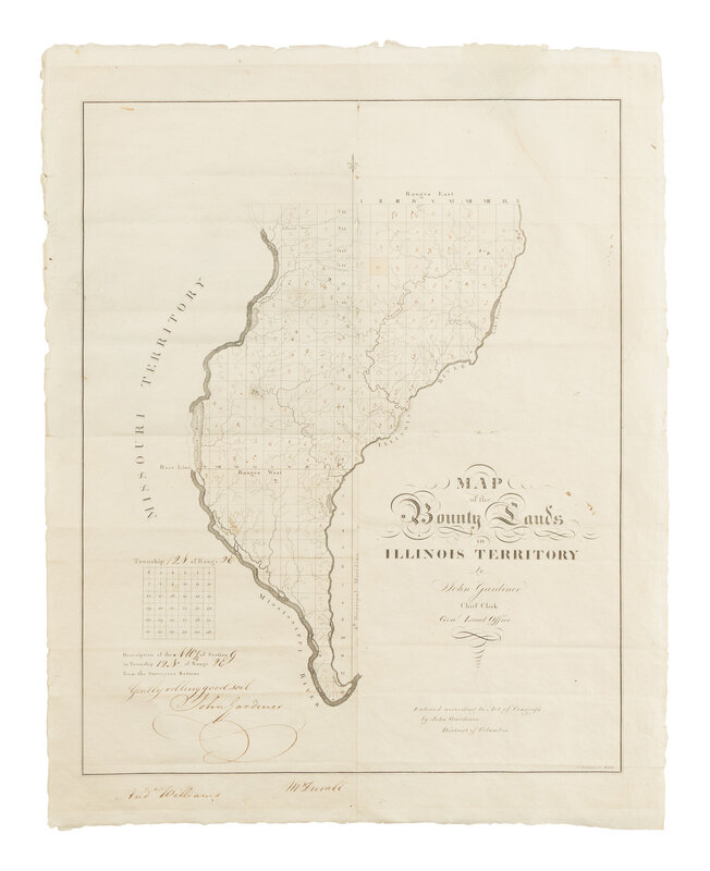 Engraved map, 533 x 432 mm. Lower portion of text accomplished in manuscript and signed by Gardiner, with the inscription "Gently rolling good soil", also signed by Andrew Williams and Mr. Duvall; each block of land annotated with identifying letters or symbols. (Old folds with few small repairs verso, large closed tear to upper blank portion of map with small loss near border repaired.) Provenance: John W. Yates (signed on verso, notations), presumably one of the War of 1812 veterans these maps were sent.