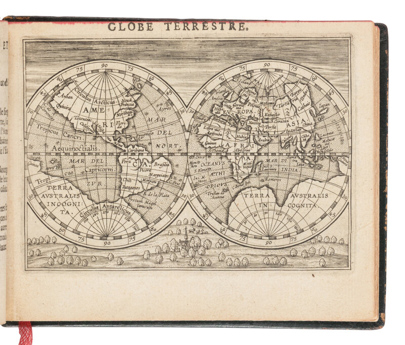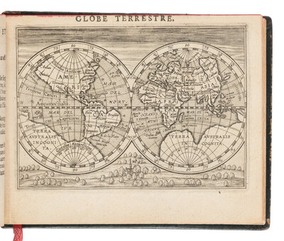 Oblong 12mo (114 x 152 mm). Engraved vignette on title-page, engraved dedicatory arms on verso, engraved view of the Escorial, 125 engraved maps (7 unnumbered). (A few small stains to title-page and a couple of leaves.) Early 20th century olive sheep gilt, spine in 5 compartments with 4 raised bands, gilt-lettering in 2, top edge stained red (joints splitting, extremities a bit worn). Provenance: Monsieur Ignancourt (contemporary signature on title-page); Raul de Almeida (bookseller's ticket).