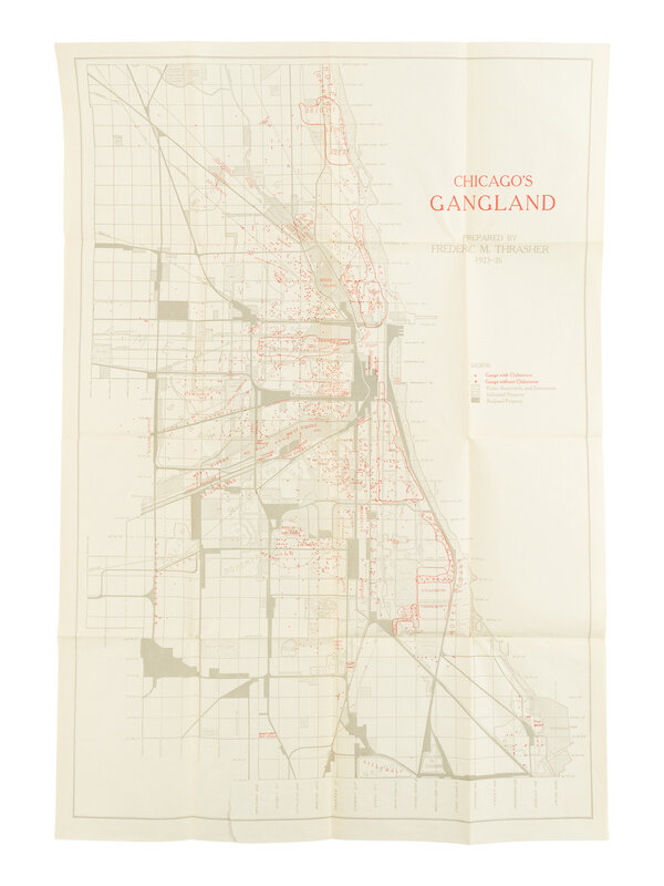 Issued to accompany sociologist Frederic Thrasher's seminal 1927 study, The Gang: A Study of 1,313 Gangs in Chicago (seen here), the map depicts the locations of youth gangs in the "poverty belt," rather than focusing on Capone's Mob. Thrasher applied thematic mapping to depict organized criminal activity to help support his thesis that such activity thrives in urban spaces. His concern was that second-generation immigrant children evolved from “play groups” and into youth gangs. His central conclusion was the identification of a place called “Gangland” … “a geographically and socially interstitial area of the city”. Numerous notations printed in red provide added detail of gang territories that include “Hobohemia” in the Gold Coast, “Jewish-Polish Frontier” in Douglas Park, and “Slave Town” in what is now Randolph Street Market.