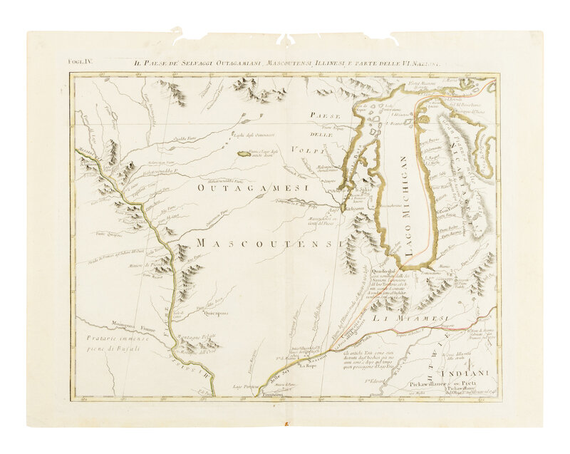 ZATTA, Antonio. Il Paese de Selvaggi Outagamiani, Mascoutensi Illinesi E partie Delle VI. Venice, 1778. Engraved map with hand-outlining. 381 x 495 mm. (Some worming at margins with small losses, old hinges on verso.)