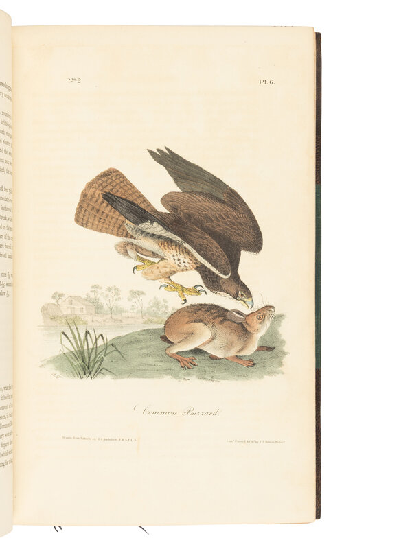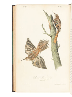 FIRST OCTAVO EDITION. Audubon’s double-elephant folio edition of The Birds of America (1827-1838) established his reputation as the greatest ornithological artist of his time. Though that edition was published in London to ensure the quality of the plates, he employed the Philadelphia firm of J.T. Bowen to produce this more commercially viable edition under the close supervision of his sons whereby the folio plates were reduced by camera lucida and lithographed. This octavo edition is considered the "first and most desirable edition in this form published during the author’s lifetime, in one hundred parts" (Sabin). The original subscription price was $100, and its commercial success granted Audubon financial security. In addition to the original plate count included in the double-elephant folio edition, the octavo edition has 65 new images for a total of 500 plates, making it "the most extensive color plate book produced in America up to that time" (Reese). Ayer/Zimmer, p.22; Bennett, p.5; McGill/Wood, p.208; Nissen IVB 51; Reese 34; Sabin 2364.