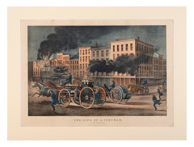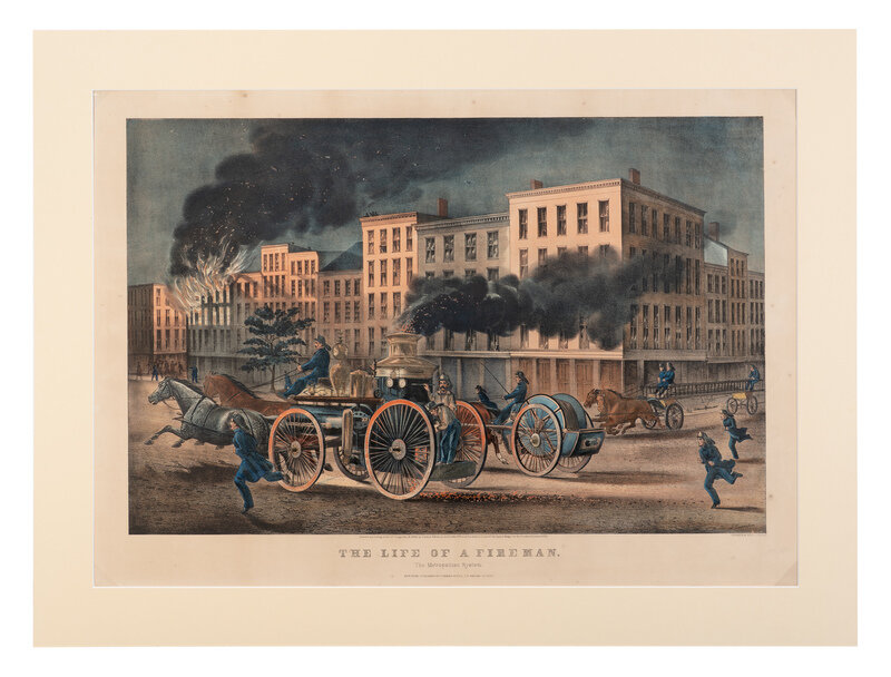 The Life of a Fireman: The Metropolitan System. 1866. (G. 3784) Large format lithograph with hand-coloring heightened in gum arabic, on wove paper. Image 29 x 20 1/2 in. Matted. Overall 34 x 25 1/2 in. Some light marginal spotting.