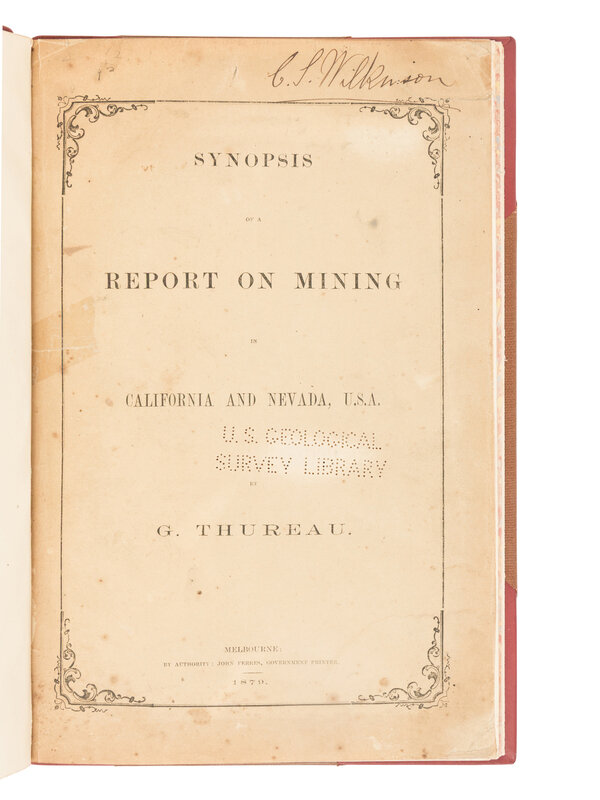 [AMERICANA]. THUREAU, Gustav Adolph Hugo (1831-1901). Synopsis of a Report on Mining in California and Nevada. Melbourne: John Ferres, 1879.