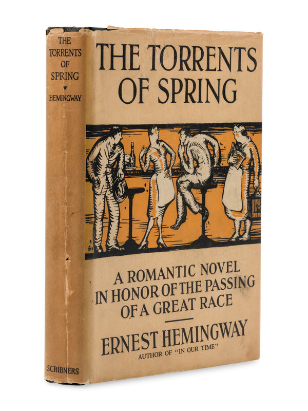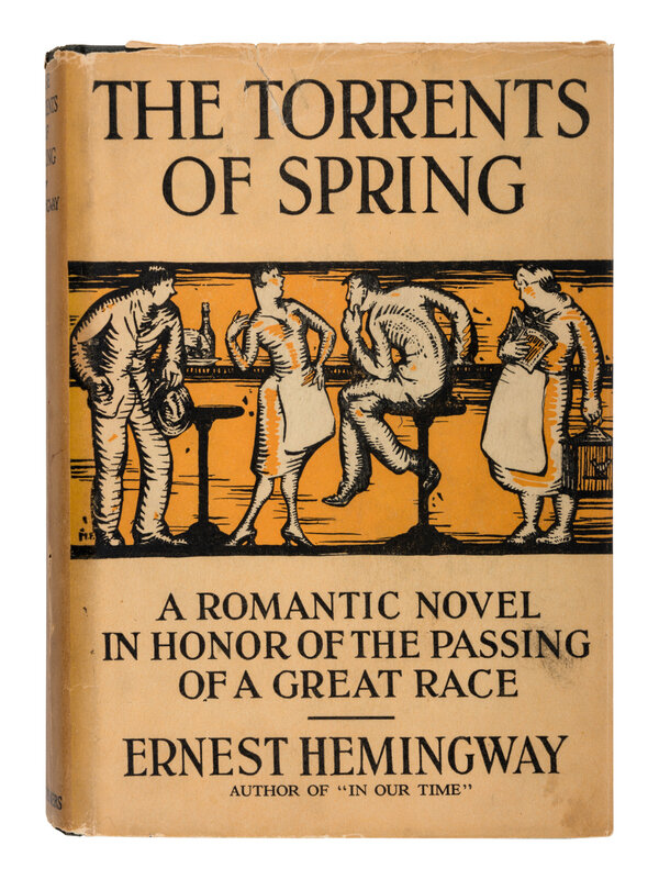 FIRST EDITION OF HEMINGWAY'S FIRST NOVEL. Hemingway's earlier works established his reputation in literary circles, but by 1925, he had not gained broader public recognition, which he attributed to his restrictive contract with Boni and Liveright, who published his earlier works. He wrote Torrents of Spring in a few weeks in November of 1925, and Boni and Liveright rejected it quickly. "I have known all along," Hemingway wrote Fitzgerald, that the firm "could not and would not be able to publish it as it makes a bum out of their present ace and best seller Anderson" (Selected Letters, p. 183). The contract broken, Hemingway signed with Scribners, and The Torrents of Spring was published on 28 May 1926. Hanneman A4a.