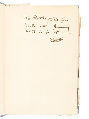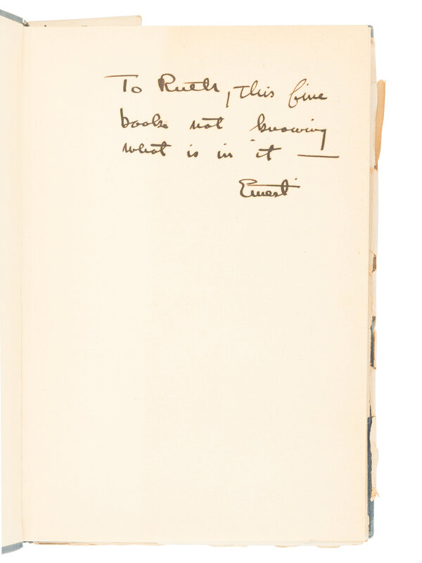 8vo. Original light blue cloth; dust jacket (chipping with losses, mostly to spine, few closed tears). Provenance: Ruth White Lowry (1884-1974), Hemingway's cousin and Kansas City native (recipient of Hemingway's inscription); pencil annotations to first few leaves