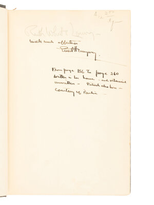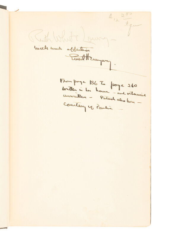 Later printing. INSCRIBED BY HEMINGWAY TO HIS COUSIN, RUTH LOWRY: "With much affection, Ernest Hemingway. From page 156 to page 260 written in her house – and otherwise unwritten – Patrick also born – courtesy of Pauline."