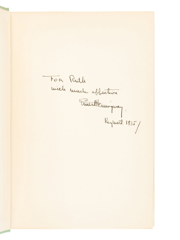 Early printing (lacking "A" on copyright). INSCRIBED BY HEMINGWAY TO HIS COUSIN, RUTH LOWRY: "For Ruth, with much affection, Ernest Hemingway, Key West 1935."