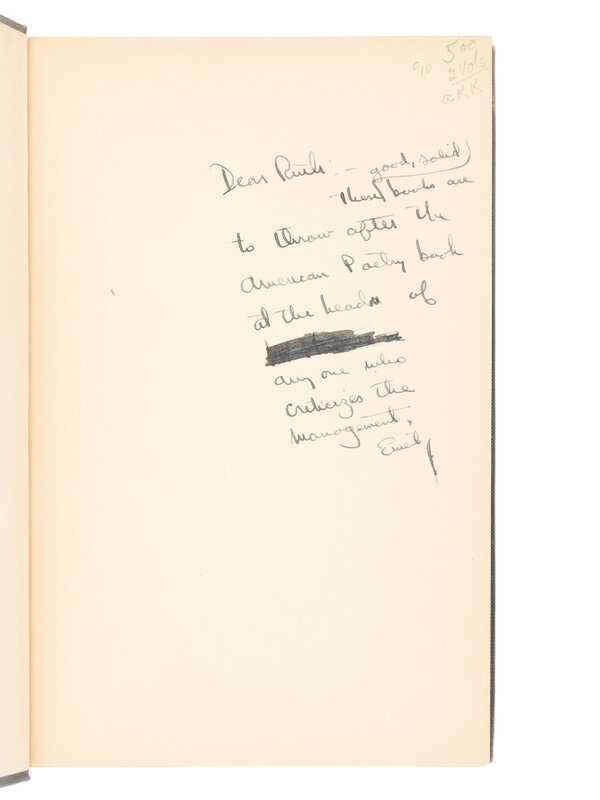 Volume 1: "These good solid books are to throw after the American poetry book at the head of [strikeout] anyone who criticizes the management. Ernest."