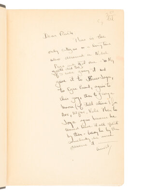 Third printing. INSCRIBED BY HEMINGWAY TO HIS COUSIN, RUTH LOWRY: "Dear Ruth, This is the only citizen in a long time who deserved a Nobel prize and got one – No, Yates did too – if I were giving it I'd give it to James Joyce, to Ezra Pound, again to this guy, then to George Moore if still alive for Ave, Atque, Vale then to Joyce again because he would have it all spent by then. Maybe by then somebody would deserve it. Ernest."