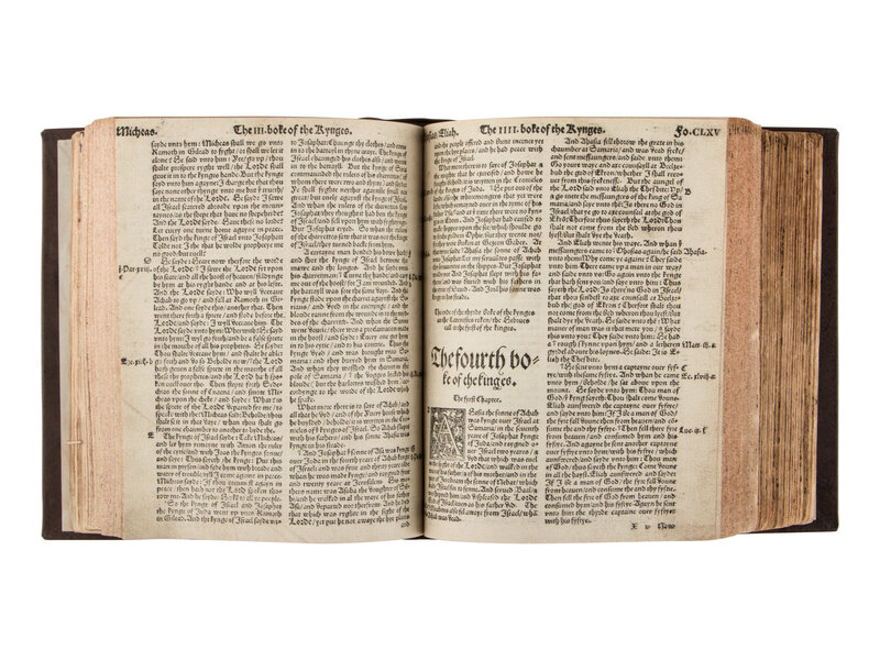 4to (212 x 171 mm). 486 (of 624) leaves. Black Letter, woodcut initials. Lacking the following signatures: *8 [title-page supplied in facsimile], A-A7 [A1 supplied in facsimile], B1, n-p8, q1-7, QQ4, aa-pp8, qq4 [New Testament]. (Approximately 180 leaves supplied from a shorter copy, A8 remargined affecting letters, a few leaves torn and repaired, g6 corner torn away, several leaves trimmed close and affecting running titles, marginal toning). Modern calf antique. Provenance: Wlm. Rowsone (early ownership inscription), possibly the eldest son of William Rawson, esq. of Bradford, Yorkshire; contemporary marginalia to a few leaves.