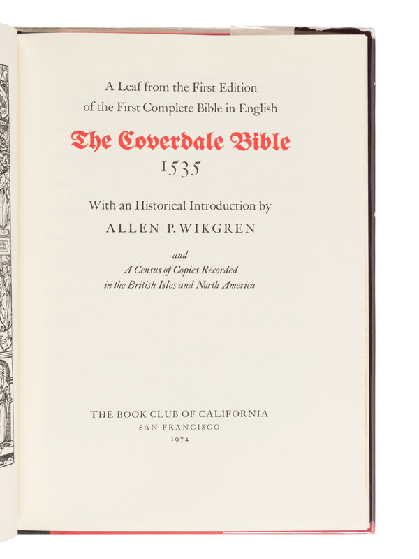[LEAF BOOK - COVERDALE BIBLE]. A Leaf from the First Edition of the First Complete Bible in English, The Coverdale Bible 1535...and a Census of Copies Recorded in the British Isles and North America. San Francisco: The Book Club of California, 1974.