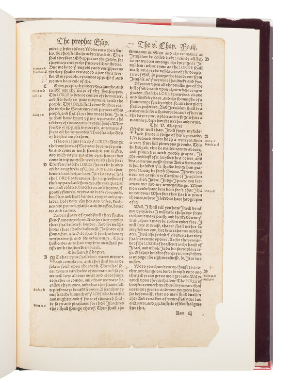 LIMITED EDITION, one of 400 copies, WITH AN ORIGINAL LEAF FROM THE 1535 COVERDALE BIBLE: a single leaf, 314 x 197 mm, text in double columns, black letter, sig. 3A3, 7 small manicules in an early hand, some underlining also in an early hand, small corner tear not affecting letters.