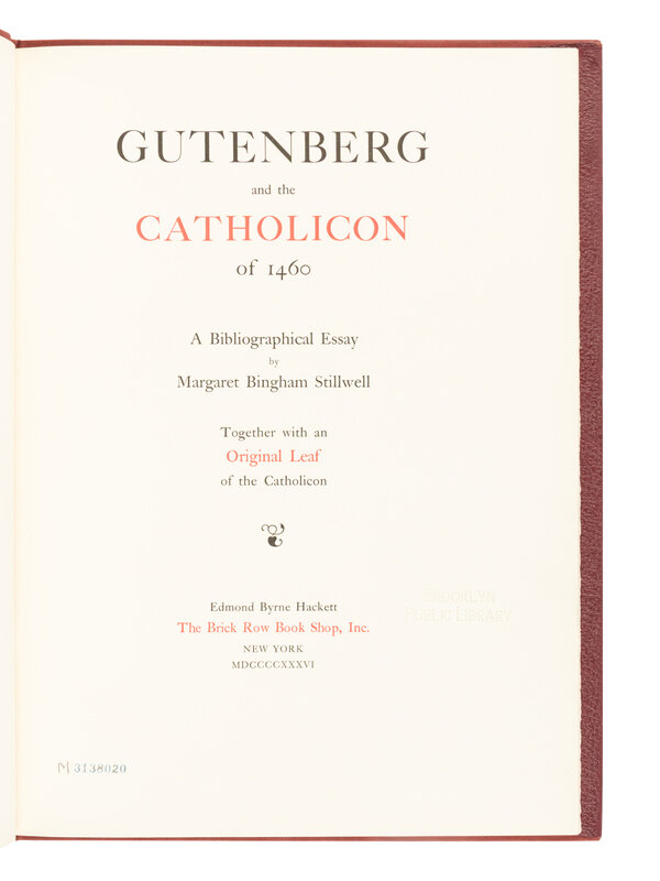 [LEAF BOOK - GUTENBERG]. Gutenberg and the Catholicon of 1460. A bibliographical essay by Margaret Bingham Stillwell. Together with an original leaf of the Catholicon. New York: Edmond B. Hackett for The Brick Row Book Shop, 1936.