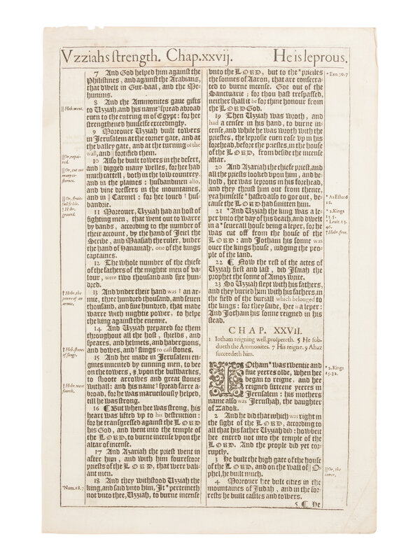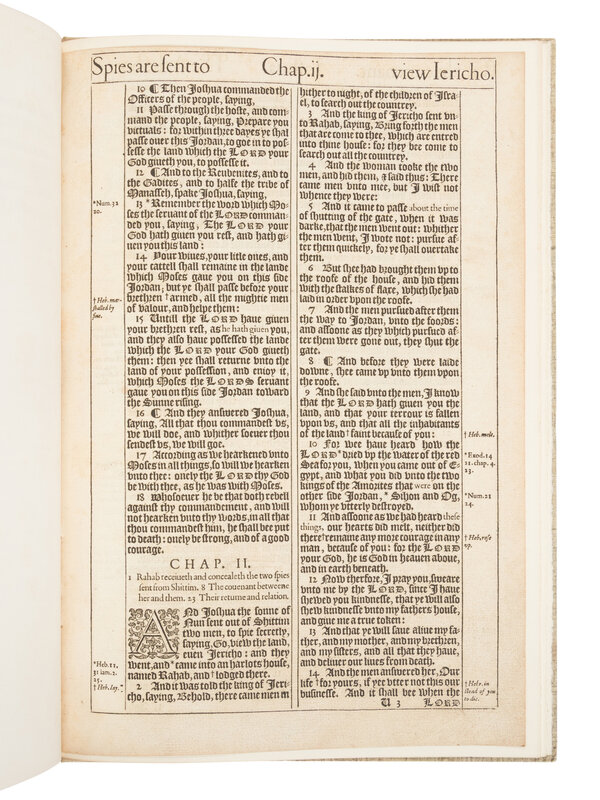 LIMITED EDITION, one of 290 copies. The King James Bible was commissioned in 1604 by the sponsorship of King James VI and I with the ultimate aim of standardizing the Bible as much as possible. Its text was compiled from the eight most common editions then in circulation and was completed seven years later. This 1611 edition is sometimes referred to as the "She Bible" due to a typographical error in the first edition of Ruth 3:15, which reads "she went into the city" instead of "he went into the city." This mistake distinguishes it from later corrected versions, including the "He Bible" edition. cf. Joel Silver, "Catalog of the Exhibition," in: Disbound and Dispersed 23.