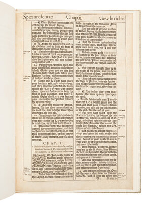 [With]: A Leaf from the 1611 King James Bible. John Livingston Lowes and Louis I. Newman, editors. San Francisco: The Grabhorn Press for The Book Club of California, 1937. Folio. With an original leaf from the 1611 King James Bible comprising the end of the first and beginning of the second chapter of the Book of Joshua. Original two-tone cloth. LIMITED EDITION, one of 300 copies. Chalmers, Disbound and Dispersed Checklist 72.