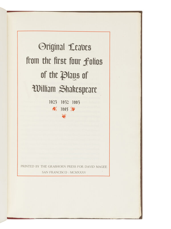[LEAF BOOK]. -- [SHAKESPEARE, William (1564-1616)]. Original Leaves from the First Four Folios of the Plays of William Shakespeare, 1623, 1632, 1663, 1685. With an Introduction by Edwin Eliott Willoughby. San Francisco: Grabhorn Press for David Magee, 1935.
