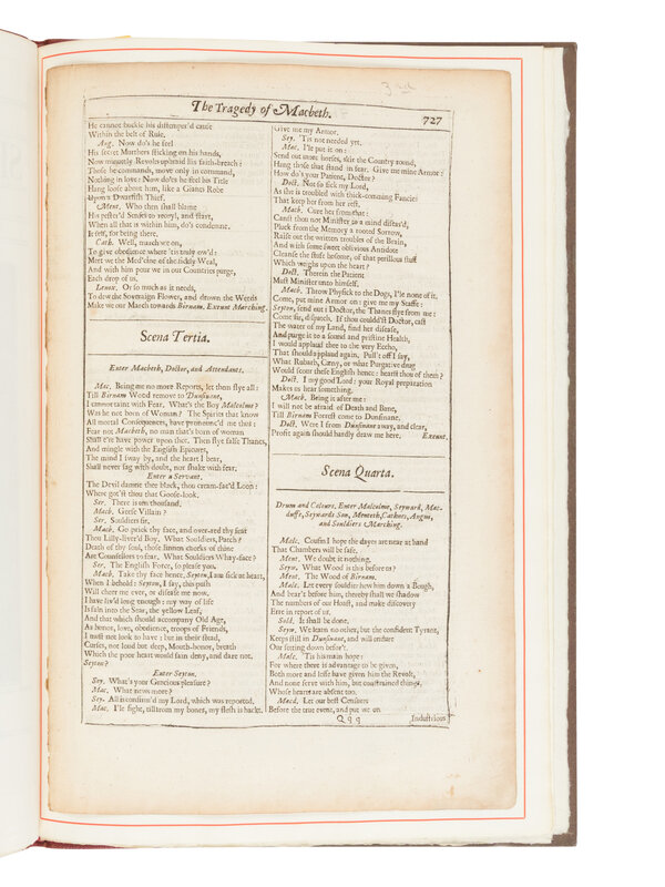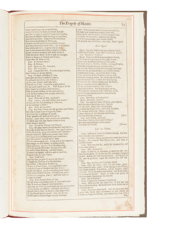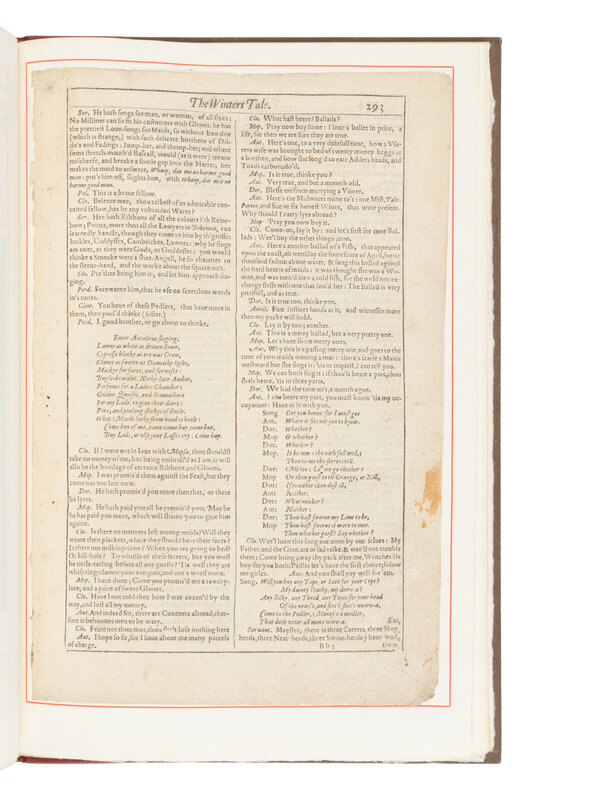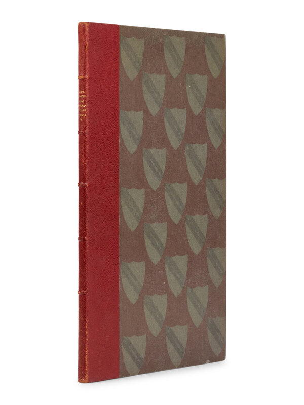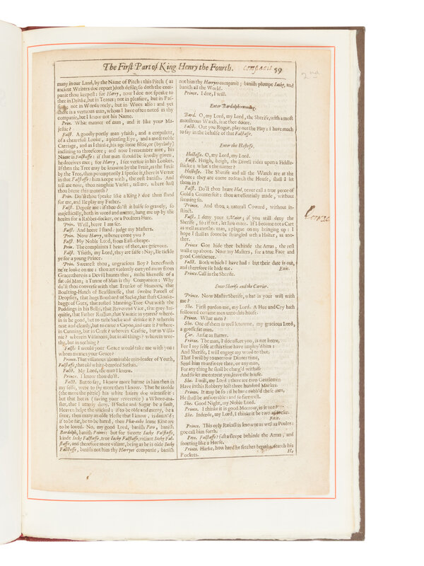 Folio. With 4 original leaves from the Shakespeare Folios tipped in. Original red morocco-backed decorative boards, spine in 6 compartments with 5 raised bands, gilt-lettering in second, uncut (light rubbing near joints). Provenance: Daniel G. Volkmann, Jr.; his sale, Fine California Press Books, PBA, 8 May 2008, lot 307.
