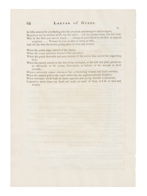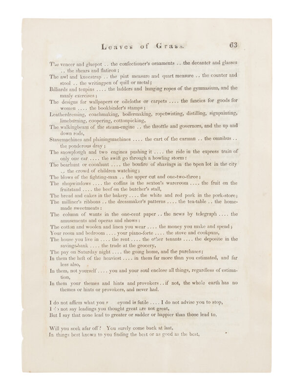 FIRST EDITION, WITH AN ORIGINAL LEAF FROM THE 1855 FIRST PRINTING OF WHITMAN'S LEAVES OF GRASS, beginning with the lines "The veneer and gluepot..." and ending with "I intend to reach them my hand and make as much of them as I do of men and women..." (pp.63-64).