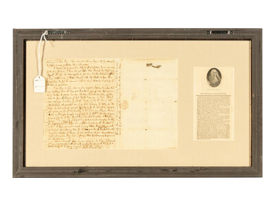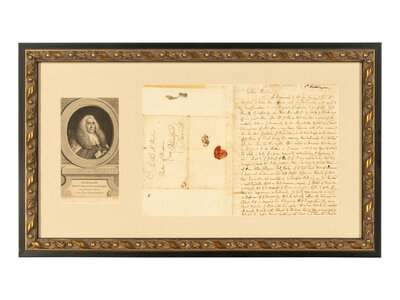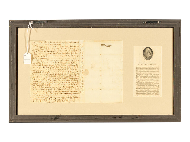 2pp. on bifolium, 4to (229 x 191 mm), old folds, remnants of original wax seal, framed and matted with contemporary engraving of William Blackstone, unexamined out of frame, overall 24 3/4 x 14 3/4 in.