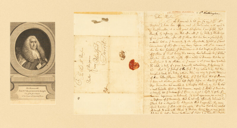 William Blackstone, an English jurist and Tory politician best known for writing Commentaries on the Laws of England, first published in four volumes by the Clarendon Press at Oxford between 1765 and 1769. At the time of the present letter's writing, he had recently been appointed accountant, treasurer, and Bursar at All Souls College at Oxford. The letter's recipient, George Bingham, had attended All Souls with Blackstone and Dr. Benjamin Buckler. During the Jacobite Rebellion, Bingham served as proctor at All Souls, and following the death of the Reverend Christopher Pitt in April 1748, Bingham was installed as his replacement at the rectory of Pimperne in Dorsetshire. The relationship between the Blackstone and Bingham remained strong following the latter's departure from All Souls, with Blackstone closing his letter by saying, "Let me hear from you at your leisure, for I hope of distance to which you are removed will not make you forgetful of your old friends, and in particular not of yours sincerely, William Blackstone."
