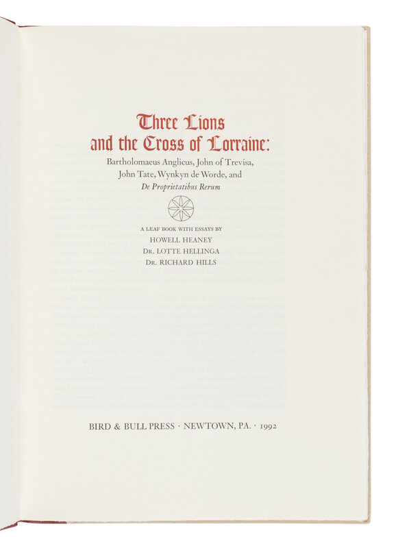 [LEAF BOOK - WYNKYN DE WORDE]. Three Lions and the Cross of Lorraine: Bartholomaeus Anglicus, John of Trevisa, John Tate, Wynkyn de Worde, and De Proprietatibus Rerum. Newtown: Bird & Bull Press, 1992.
