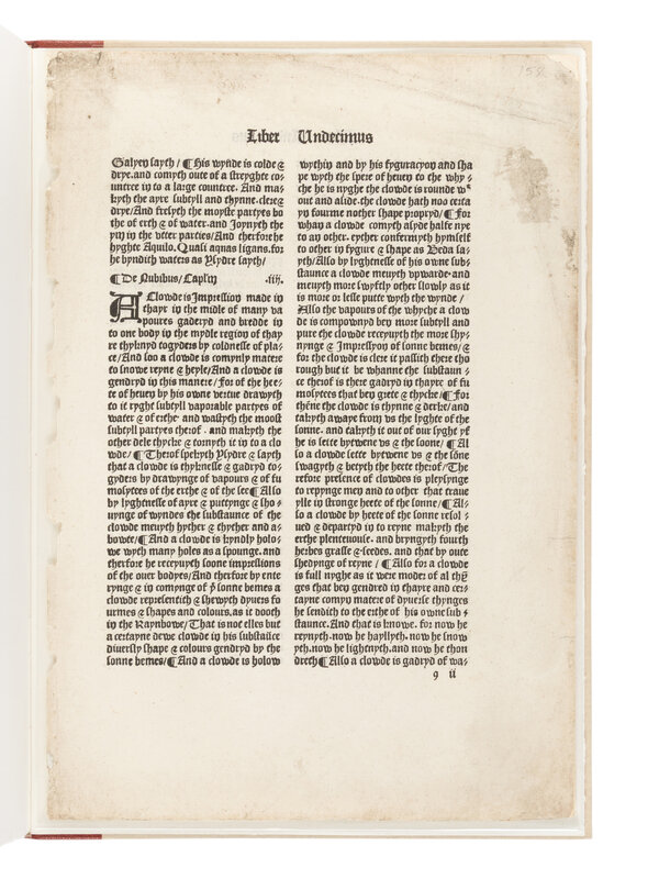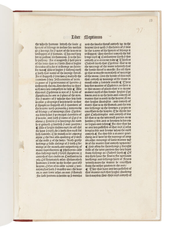 LIMITED EDITION, number 59 of 138 copies, WITH AN ORIGINAL LEAF FROM THE 1495 DE PROPRIETATIBUS RERUM: a single leaf, 305 x 203 mm, printed in Westminster by Wynkyn de Worde in 1495, double-column text, pagination "97" in an early hand and a later pagination "88" in pencil, both in upper corner, first line of text beginning with "the whyche humour lettyth the soule..." and ending with "in feuer acu without rewme it is a go." ISTC ib00143000.