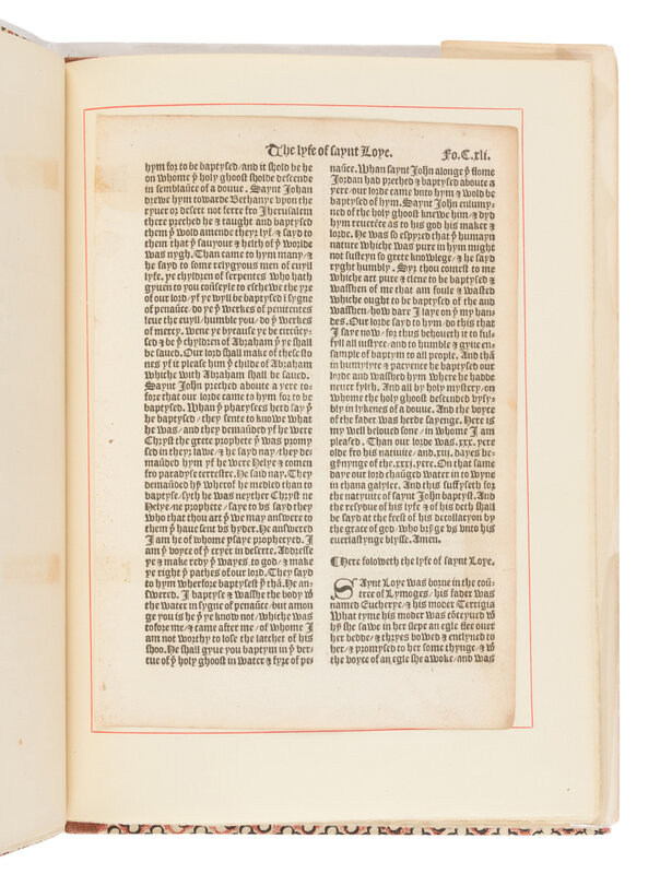 [With:] A Short Account of the Life and Work of Wynkyn de Worde with a Leaf from the Golden Legend Printed by Him at the Sign of the Sun in Fleet Street, London, the Year 1527. San Francisco: Grabhorn Press for the Book Club of California, 1949. Folio. With an original leaf (ff. 141) from the Golden Legend printed by Wynkin de Worde in 1527, tipped in. Original cloth-backed patterned boards; dust jacket (chipping). LIMITED EDITION, one of 375 copies.