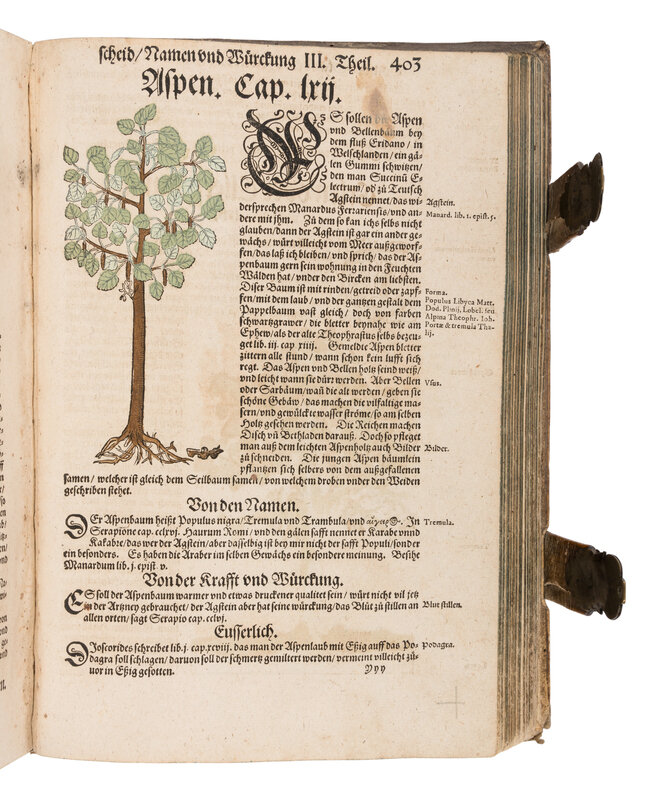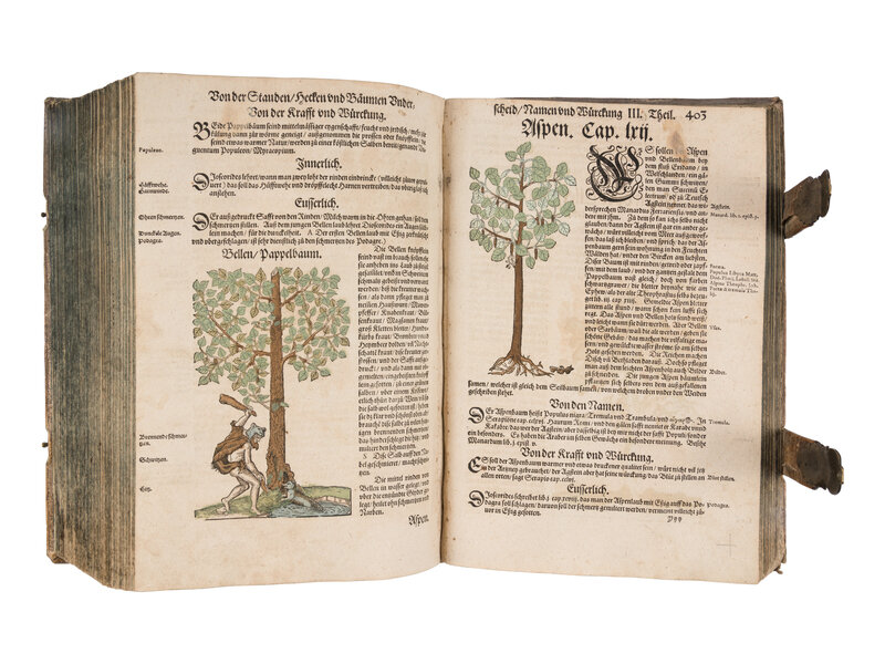 Small folio (295 x 202 mm). Woodcut portrait of Bock; 579 woodcut illustrations on 531 leaves. (Title-page and a6 portion of 3G1 provided in facsimile, repairs to lower margin of a few leaves occasionally touching letters, some soiling and staining.) Contemporary pigskin over beveled wooden boards, decorated in blind, later lettering-piece on spine, with clasps and catches (some soiling). Provenance: Early annotations on rear blank leaf.