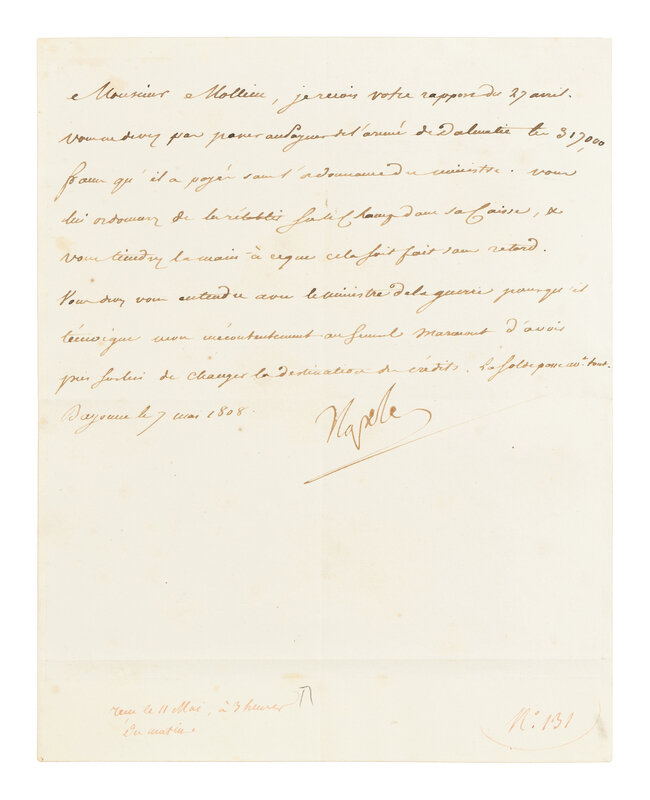 Following the French invasion of its former ally Spain in February 1808, the Spanish government was thrown into chaos as it found itself battling not only Napoleon's invading forces but also uprisings from its own citizens. On 17 March the citizens of Aranjuez rose against King Charles IV in favor of his son Ferdinand VII, and Charles abdicated the throne two days later. Desperate to regain power, Charles appealed to Napoleon for help in overthrowing Ferdinand. In April Napoleon summoned father and son to Bayonne and on 7 May forced both Charles and Ferdinand to abdicate the Spanish crown, which he immediately granted to his brother Joseph. The Spanish people, already resistant to the French invasion, launched a fierce guerilla warfare campaign against their conquerors, a situation which led to an increased military presence in Spain which stretched Napoleon's military forces to the breaking point. The present letter, dated the same day as the forced abdications of Charles and Ferdinand and addressed to Napoleon's Minister of the Treasury, captures a moment of triumph which would ultimately lead to ruin; within eight years Napoleon's reign would come to a decisive end at the Battle of Waterloo.