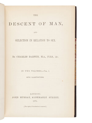 [NATURAL HISTORY]. DARWIN, Charles (1809-1882). The Descent of Man. London: John Murray, 1871.