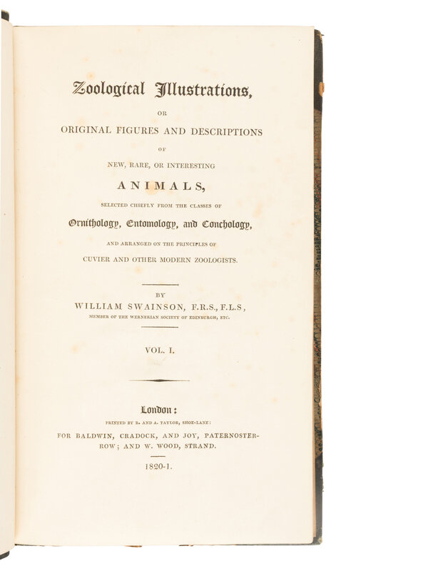 FIRST EDITION, combining the first and second series. Swainson was a British naturalist and illustrator known for his contributions to zoology and the use of the then-new art of lithography, in scientific illustration. His adoption of lithographic printing, rather than traditional engraving, allowed for more efficient and detailed reproductions of natural history subjects. Nissen IVB 911.