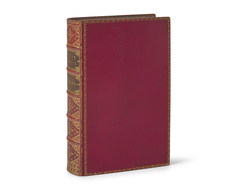 8vo. Engraved frontispiece, engraved vignette title-page, and 38 engraved plates by Hablot Knight Browne. (Light scattered spotting to text and plates.) Full crimson calf, green morocco spine labels, decorated in gilt, marbled edges (joints rubbed). Provenance: Fernand Spaak (bookplate on front paste-down; typed bibliographical description mounted to same).
