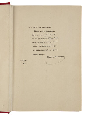 [With:] ALS ("Irving Bacheller") to Wallack, 5 August 1936, 1p., old folds, original envelope. In full: "I have inscribed the book and am returning it today. I congratulate you on having so perfect a copy of the first edition. You are good enough to suggest sending a bottle. I wouldn't ask you to do that but I will drink to your health this very evening."