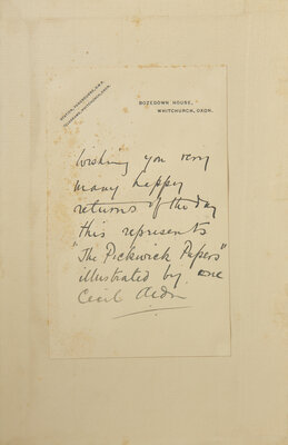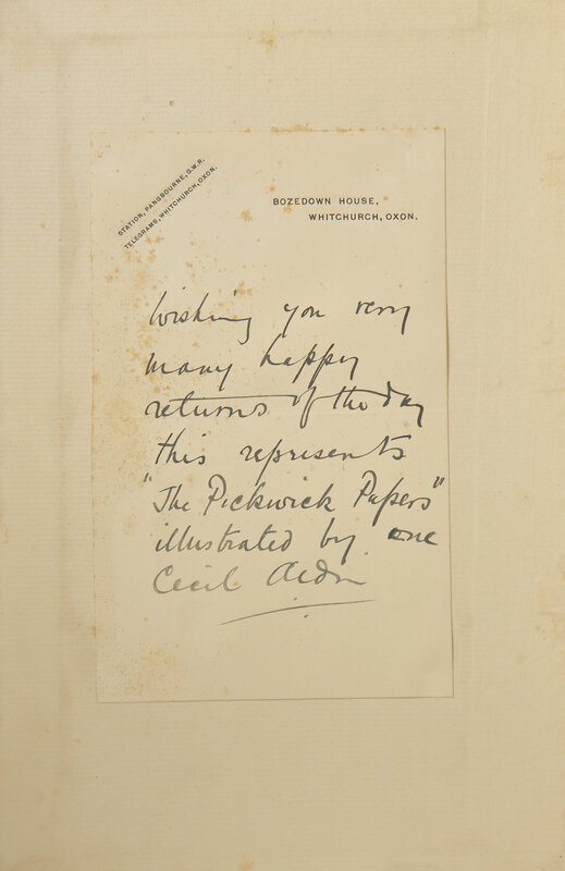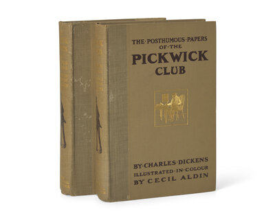 PRESENTATION COPY, inscribed by the illustrator on the front pastedown in vol.1 and with an original signed graphite and crayon drawing of Samuel Pickwick by him below same ("To Mr Charles Palmer / Wishing you many happy / returns of the day / Dec 31. 1910"); additionally with an autograph letter, signed by Aldin mounted to front paste-down of second volume: "Wishing you very many happy returns of the day this represents 'The Pickwick Papers' illustrated by one Cecil Aldin".