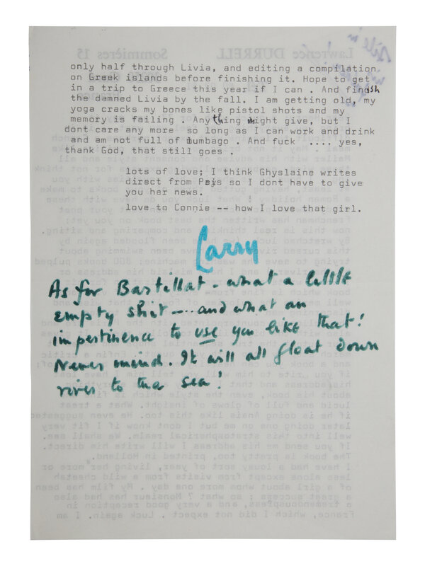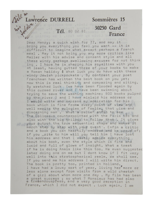 [With:] DURRELL. Typed letter signed ("Larry"), to Henry Miller, Gard France, 2 August 1981. 2pp., 8vo, on personal letterhead. Durrell writes in part: "Dear Henry; A quick wish for 77, and may it bring you everything you feel you want - it is difficult to imagine what except perhaps a French meal. May it not bring you any more critics like Mailer with his advice and consent style and all these windy garage swallowing excuses for not thinking. I hope he is sharing his royalties with you at least, having gutted three of your books to make a Roman holiday...What luck you have with these windy Jewish pickpockets. By contrast you poet Frenchman has written the best book on you yet...if you write to him will you tell him I have lost your address and that I vastly admire everything about his book, even the style which is fine and lucid and full of glows of insight. What a treat if he is doing Anais like this too..." Durrell adds in green ink: "As for Batrillat - what a little empty shit...and what an impertinence to use you like that! Never mind. It will all float down river to the sea!"