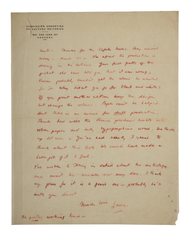[With:] DURRELL. Autograph letter signed ("Larry") to Claude Smith Jr. of House of Books, San Juan, 14 March 1963. 1p., 4to, old folds, original mailing envelope. Durrell writes a somewhat scathing letter to a publisher. "You've had nearly 3 years to think about this book. We could have made a better job of it I feel." Durrell also discusses his plans with Henry Miller to publish an anthology.