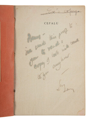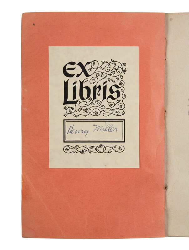 8vo. Original pinkish-orange wrappers, upper cover with printed paper labels (spine faded with a few discrete repairs, rusted staples removed and resewn). Provenance: Henry Miller (1891-1980), American author (signed bookplate and recipient of author's inscription); Eve Miller (notation above inscription: "Eve's copy"); sold to W.L. Godshalk, of the University of Cincinnati, and C. Sligh, at the University of Virginia, by Valentine Miller and Tony Miller, through Lee Perron Fine Books, on 22 July 2005 (see following lot for provenance list).