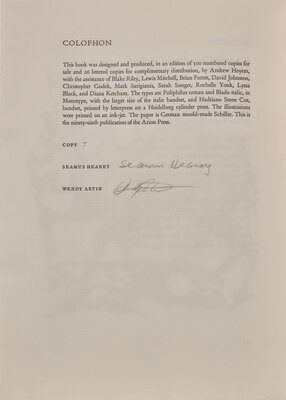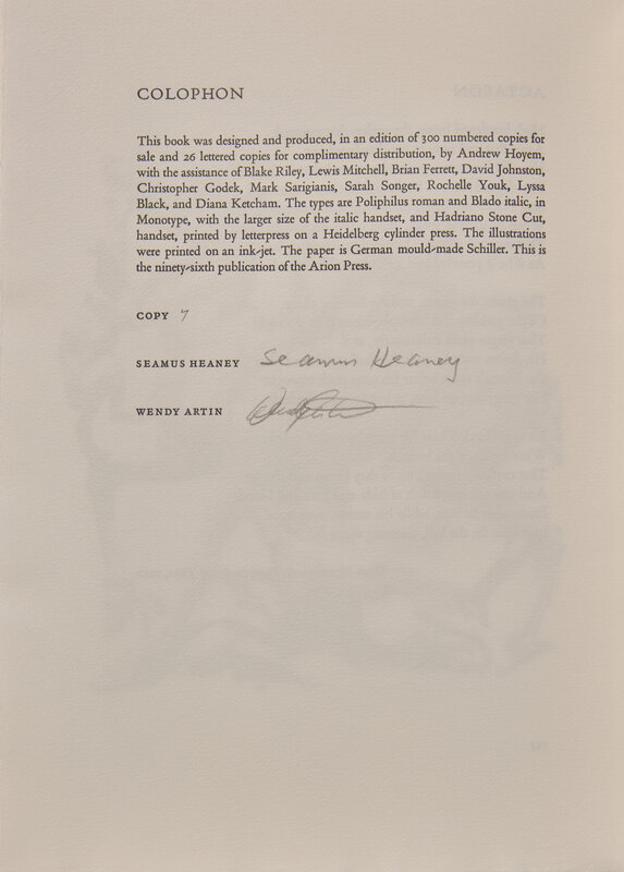 LIMITED EDITION, number 7 of 300 copies, SIGNED BY HEANEY and Artin, from a total edition of 326.