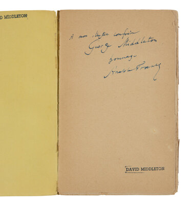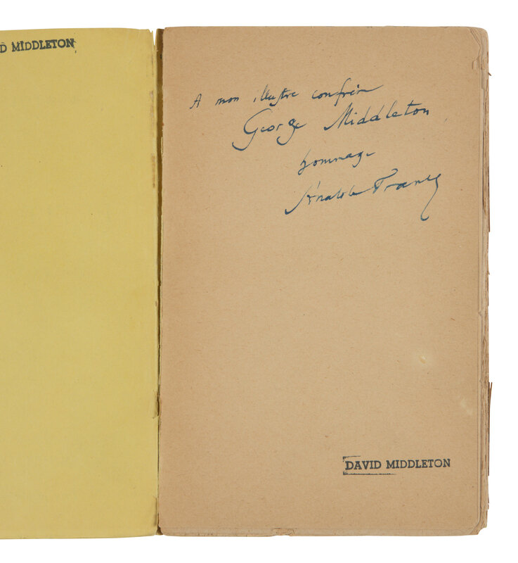 8vo. Half-title. Original printed yellow wrappers (light soiling to covers, some light edgewear); morocco-backed slipcase. Provenance: George Middleton (1880-1967), American playwright (recipient of author's inscription); David Middleton (ownership stamp on front endpapers).