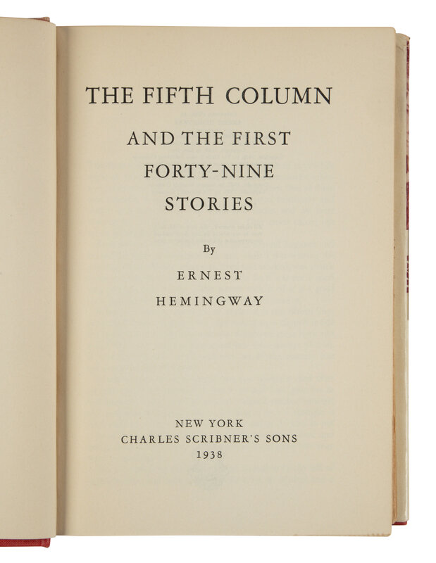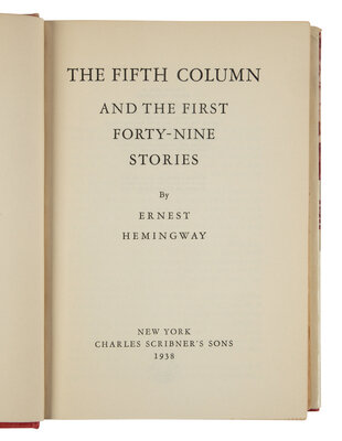 HEMINGWAY, Ernest (1899-1961). The Fifth Column and the First Forty-Nine Stories. New York: Charles Scribner's Sons, 1938.