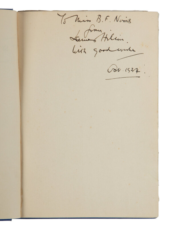 8vo. Original gilt-lettered blue cloth; dust jacket (chipped and torn with losses, repairs on verso, extremities soiled). Provenance: Miss B.F. Norris (recipient of inscription from the author on the front fly leaf).