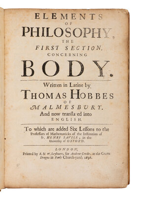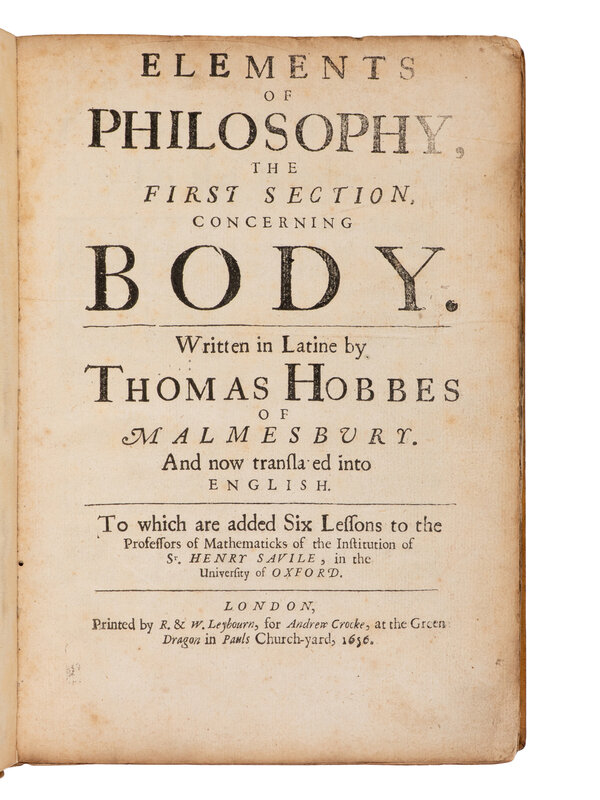 HOBBES, Thomas (1588-1679). Elements of philosophy, the first section, concerning body... now translated into English... To which are added Six lessons to the professors of the mathematiques. London: R. & W. Leybourn for A. Crooke, 1656.