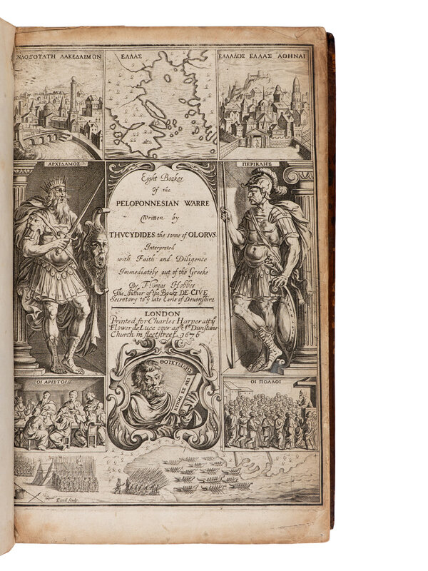 [With:] THUCYDIDES. Eight Bookes of the Peloponnesian Warre...Interpreted with Faith and Diligence Immediately out of the Greeke by Thomas Hobbes. London: for Charles Harper, 1676. Folio. Engraved historiated title, title-page printed in red and black, 5 folding engraved plates. Contemporary paneled calf (rebacked, upper cover partially detached). Second edition.