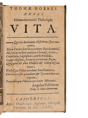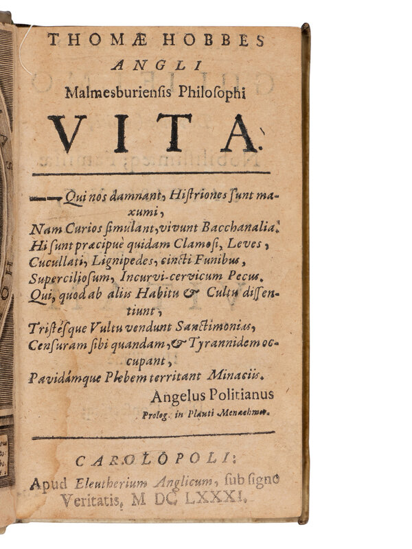 [With:] HOBBES, Thomas. Angli Malmesburiensis philosophi vita. Carolopoli: Eleutherium Anglicum [i.e. London: Crooke], 1681. 12mo. Engraved portrait frontispiece. Contemporary vellum. FIRST COLLECTED EDITION. [Bound with:] CARDANO, Girolamo. Mediolanensis, de Propria vita liber. Amsterdam: Johan Ravenstein, 1654.