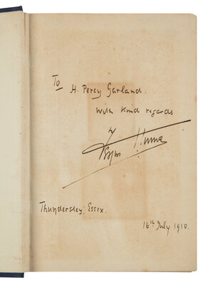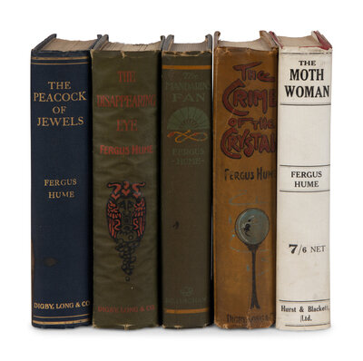 [With]: HUME. A group of 4 FIRST EDITIONS, comprising: The Crime of the Crystal. London: Digby, Long, & Co., 1903. -- The Mandarin's Fan. New York: G.W. Dillingham Company, 1904. -- The Disappearing Eye. London: Digby, Long, & Co., 1909. -- The Peacock of Jewels. London: Digby, Long, & Co., 1910. INSCRIBED BY HUME TO H. PERCY GARLAND, "With kind regards." Provenance: Florence and Edward Kaye (morocco bookplate). -- Together, 4 works in 4 volumes, all 8vo, all in original cloth, condition generally fine.