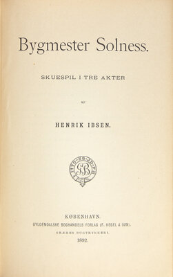 IBSEN, Henrik (1828-1906). Bygmester Solness. Skuespil I Tre Akter. Copenhagen: Gyldendalske Boghandels Forlag [F. Hegel & Son], 1892.